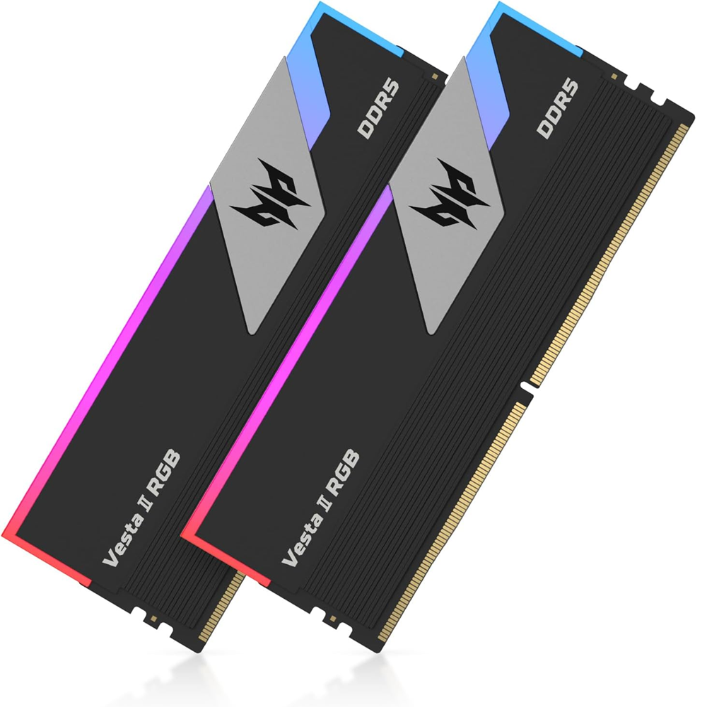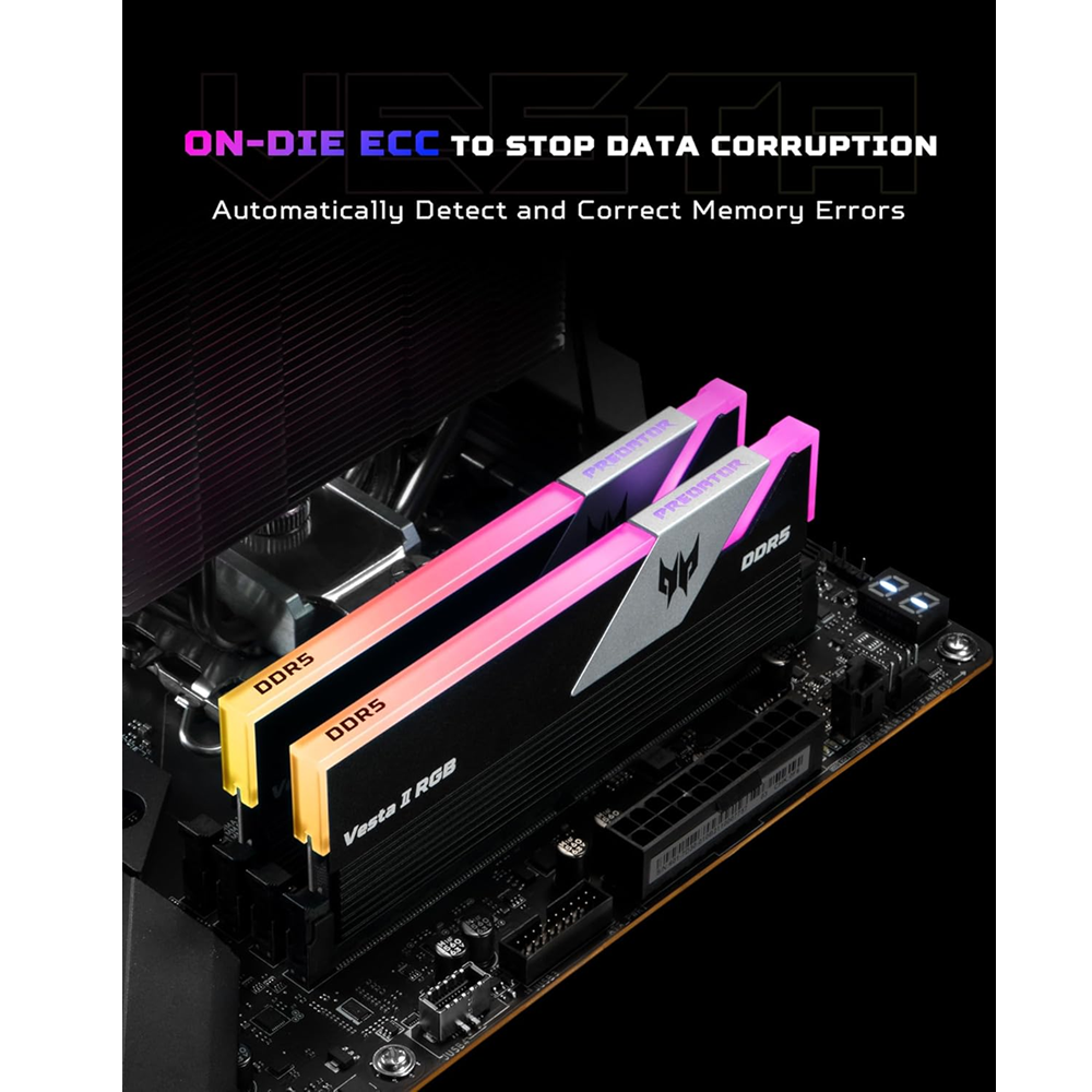 Take your gaming and computer experience to new heights with the latest generation of DDR: Acer Predator Vesta II DDR5 lets you run at MAX 7200 MHz. It’s blazing fast but also a top-notch performer with sleek design, ultra-low timings, customizable RGB lighting and stylish metallic heat sink. Built with quality components, Vesta II DDR5 features on-die Error Correction, the latest in one-click overclocking and PMIC (programmable Power managment IC).