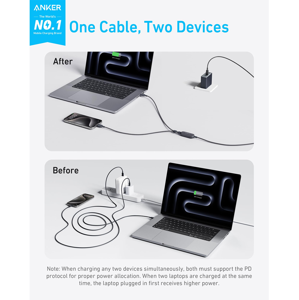 1. The cable supports PD, PPS, and PIQ 2.0 protocols for fast charging when using a single port; dual ports do not support PPS; 2. When only one device is connected, the charging power can reach up to 140W; 3. When two laptops are used simultaneously, the first laptop plugged in receives a higher power. The actual power each device receives depends on its power needs; 4. When charging two devices at the same time, the total maximum power can reach 130W only if one of the devices requires more than 100W. Otherwise, the total power will not exceed 100W; 5. Use the recommended power adapter for optimal results. Charging two devices with a charger less than 45W is not advised as it will result in slower charging. Both devices must support the PD charging protocol. Non-PD compatible devices may experience slower charging.