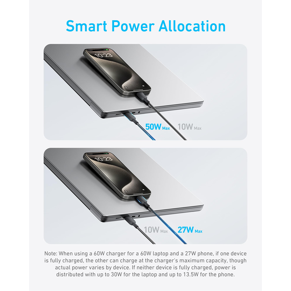 Intelligent Distribution of Power: Built-in smart power management adapts power output to match the charging requirements of each connected device seamlessly. Note: Please refer to the charging guide to understand the power allocation when charging two devices at the same time.