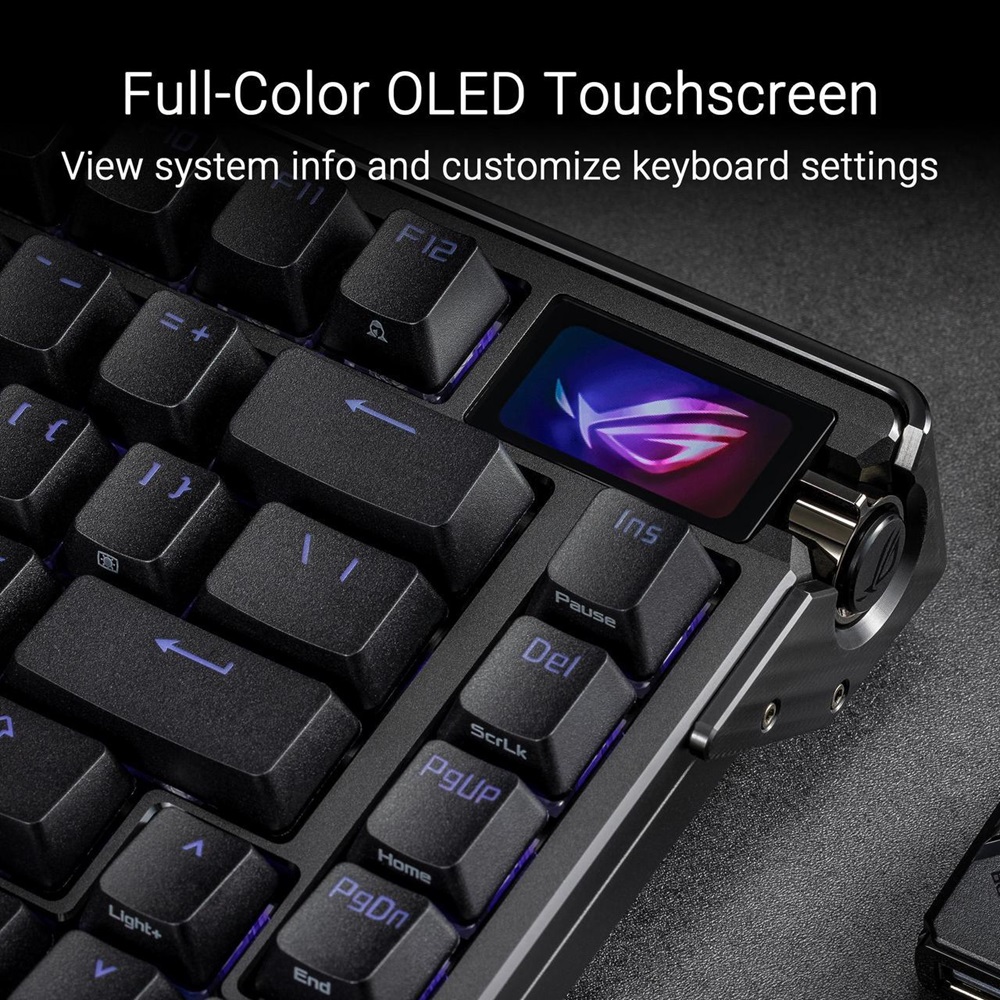The ASUS ROG Azoth Extreme is a customizable 75% gaming keyboard with a premium aluminum-alloy chassis and metal frame. It features an 8000 Hz report rate with the ROG Polling Rate Booster and over 1600 hours of battery life in ROG SpeedNova 2.4 GHz wireless mode. The upgraded OLED touchscreen and three-way knob enable system monitoring and quick adjustments. The carbon-fiber positioning plate ensures a crisp typing sound, while three dampening layers absorb vibrations. An adjustable gasket mount with a paddle switch offers two typing preferences.