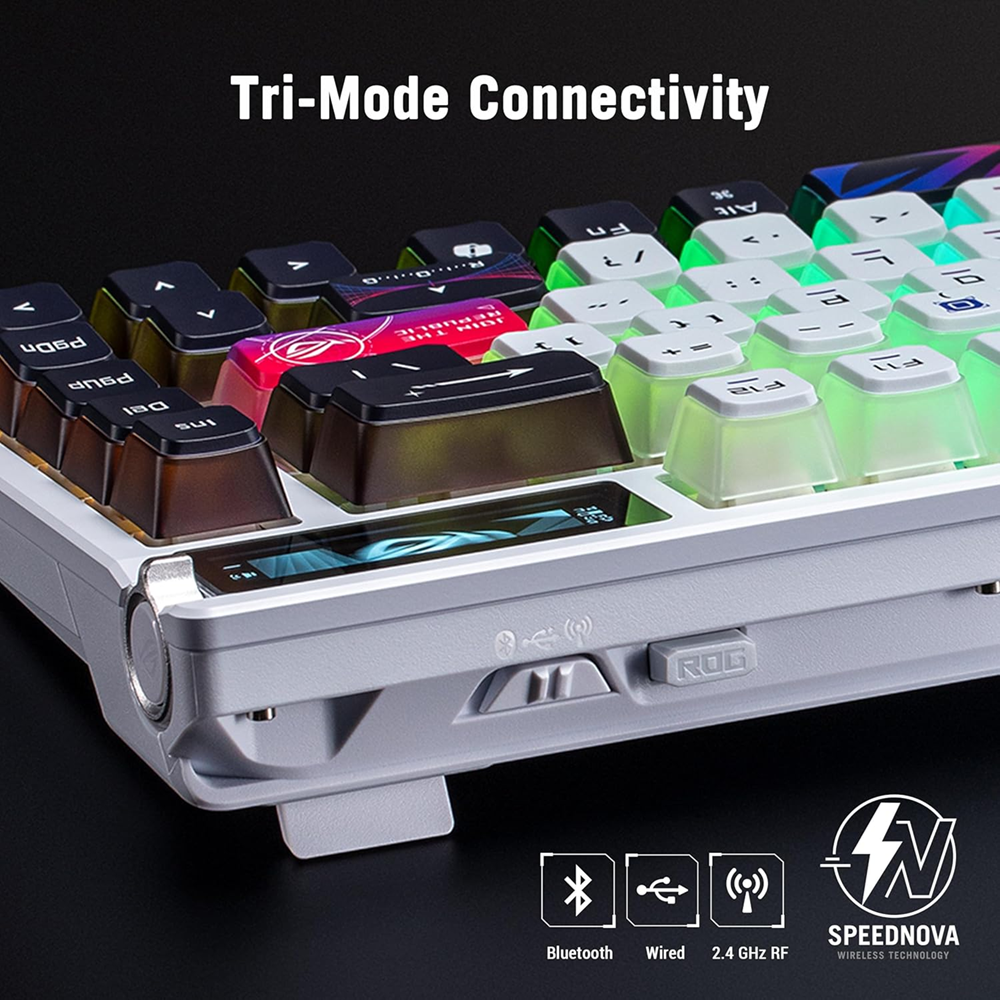 • Tri-mode connection: Connect via Bluetooth® (up to three devices simultaneously), 2.4 GHz with ROG SpeedNova wireless technology, or wired USB