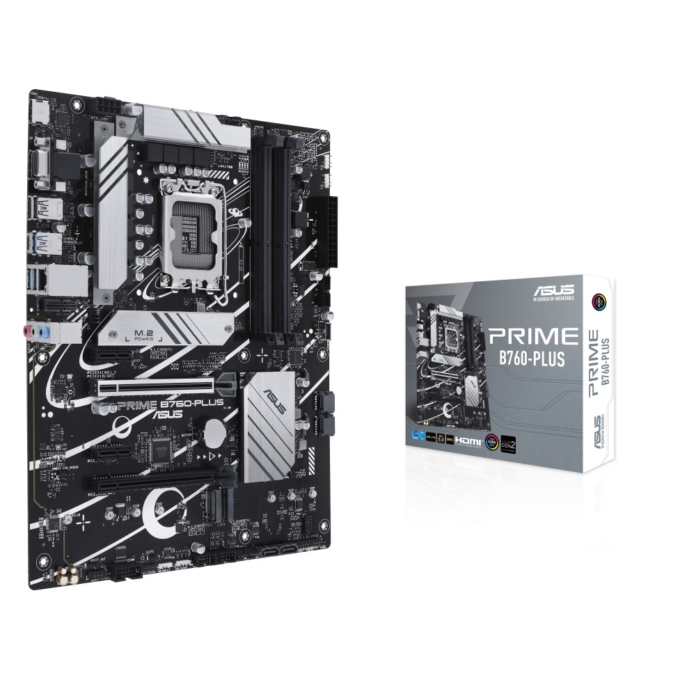 ASUS Prime B760-PLUS, an Intel® B760 LGA 1700 ATX motherboard with PCIe 5.0, three PCIe 4.0 M.2 slots, DDR5, Realtek 2.5Gb Ethernet, DisplayPort, VGA, HDMI™, SATA 6 Gbps, USB 3.2 Gen 2×2 Type-C®, front USB 3.2 Gen 1 Type-C®, Thunderbolt™ (USB4®) support, Aura Sync