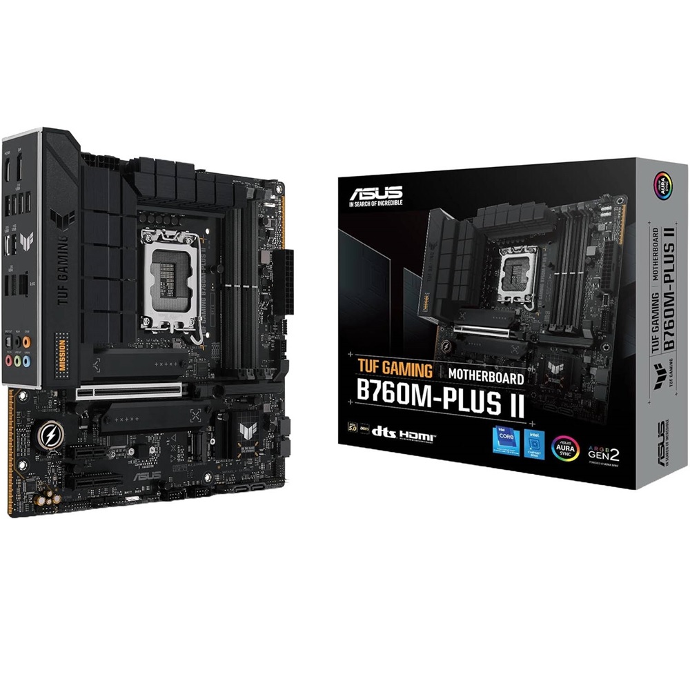 ASUS TUF GAMING B760M-PLUS II takes all the essential elements of the latest Intel® processors and combines them with game-ready features and proven durability. Engineered with military-grade components, an upgraded power solution and a comprehensive cooling system, this motherboard goes beyond expectations with rock-solid performance for marathon gaming. TUF GAMING motherboards also undergo rigorous endurance testing to ensure that they can handle conditions where others may fail. Aesthetically, this model incorporates an embossed nameplate and geometric design elements to reflect the dependability and stability that defines the TUF GAMING series. This platform delivers the power and connectivity that advanced AI PC applications demand.