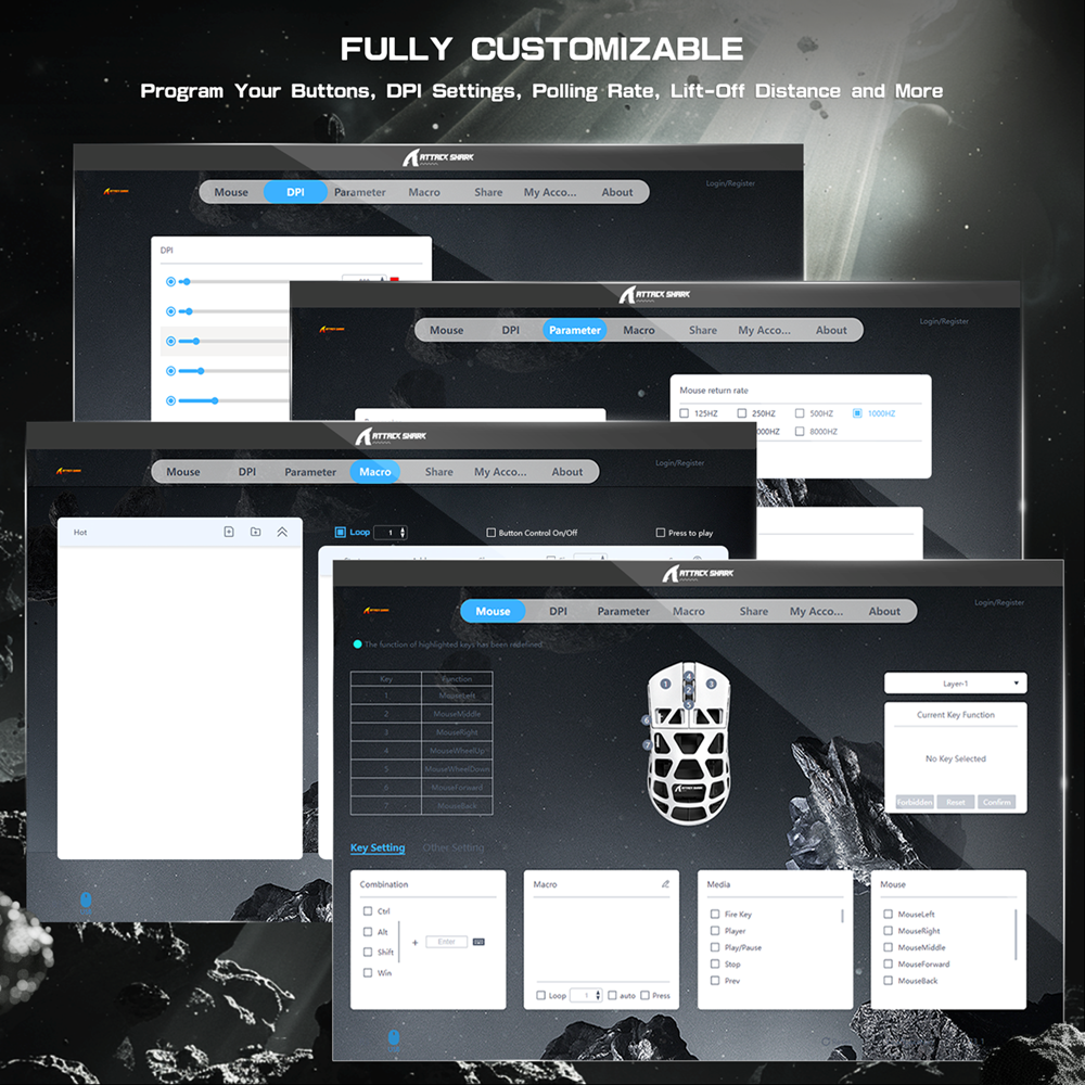 Configure your mouse in driver software to program your buttons, DPI settings, polling rate, lift-off distance and more. If you encounter any issues during software installation or product usage, please reach out to us promptly for dedicated assistance.
