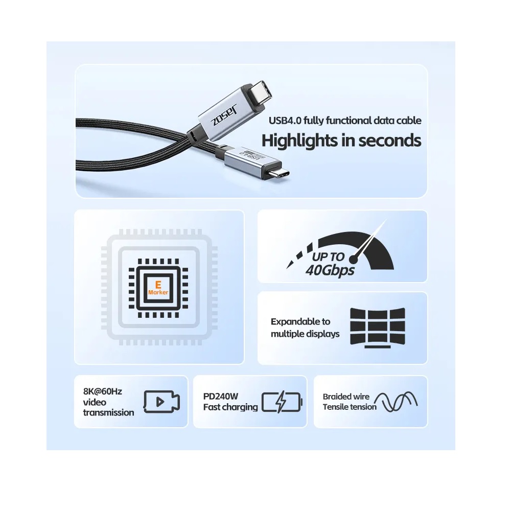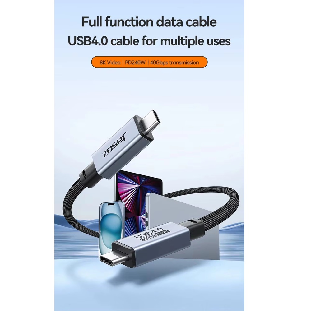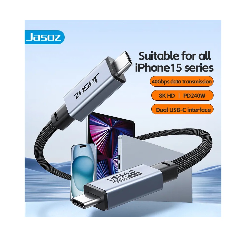 Jasoz D119 USB4 fully functional data cable supports protocols such as USB3.2/3.1 and Thunderbolt 3, and is multi-purpose in one cable. It has a high current of 5A (Max) and supports up to PD240W power. The data transmission speed is up to 40Gbps, and the digital signal transmission resolution is up to 8K@60Hz Suitable for devices with USB-C interface, such as mobile phones, laptops, tablets, etc. The product adopts high-quality oxygen-free copper wire cores and USB4 dedicated chips, with high performance, low power consumption, and wider compatibility, making it the best assistant for working from home.