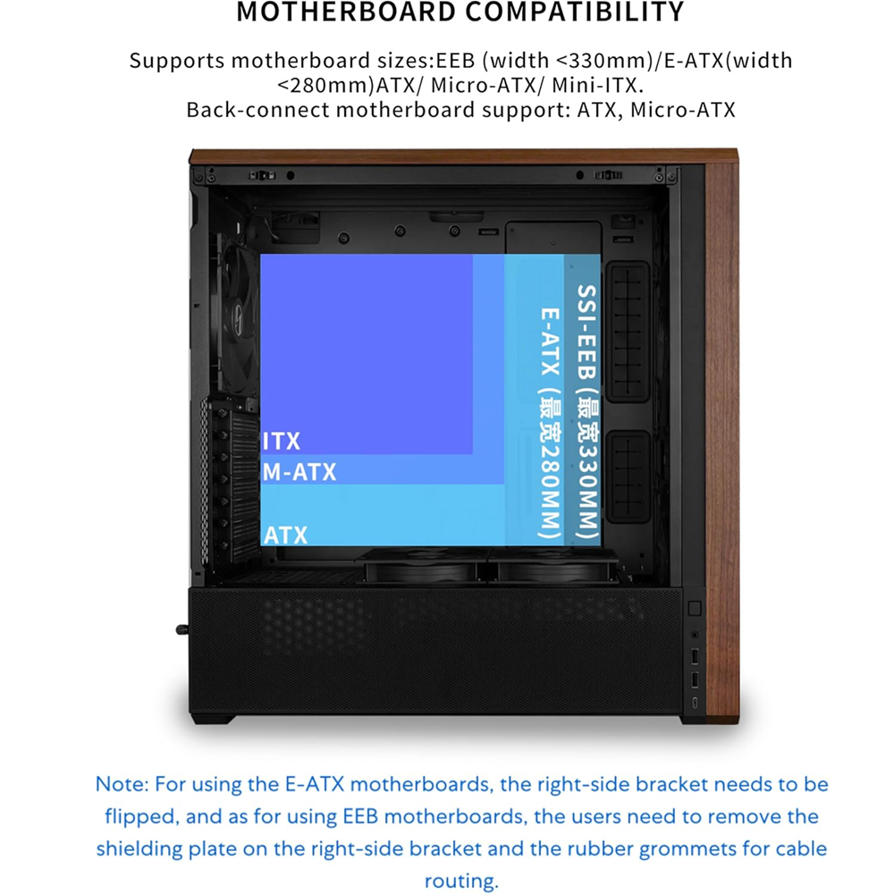 Note: For using the E-ATX motherboards, the right-side bracket needs to be flipped, and as for using EEB motherboards, the users need to remove the shielding plate on the right-side bracket and the rubber grommets for cable routing.