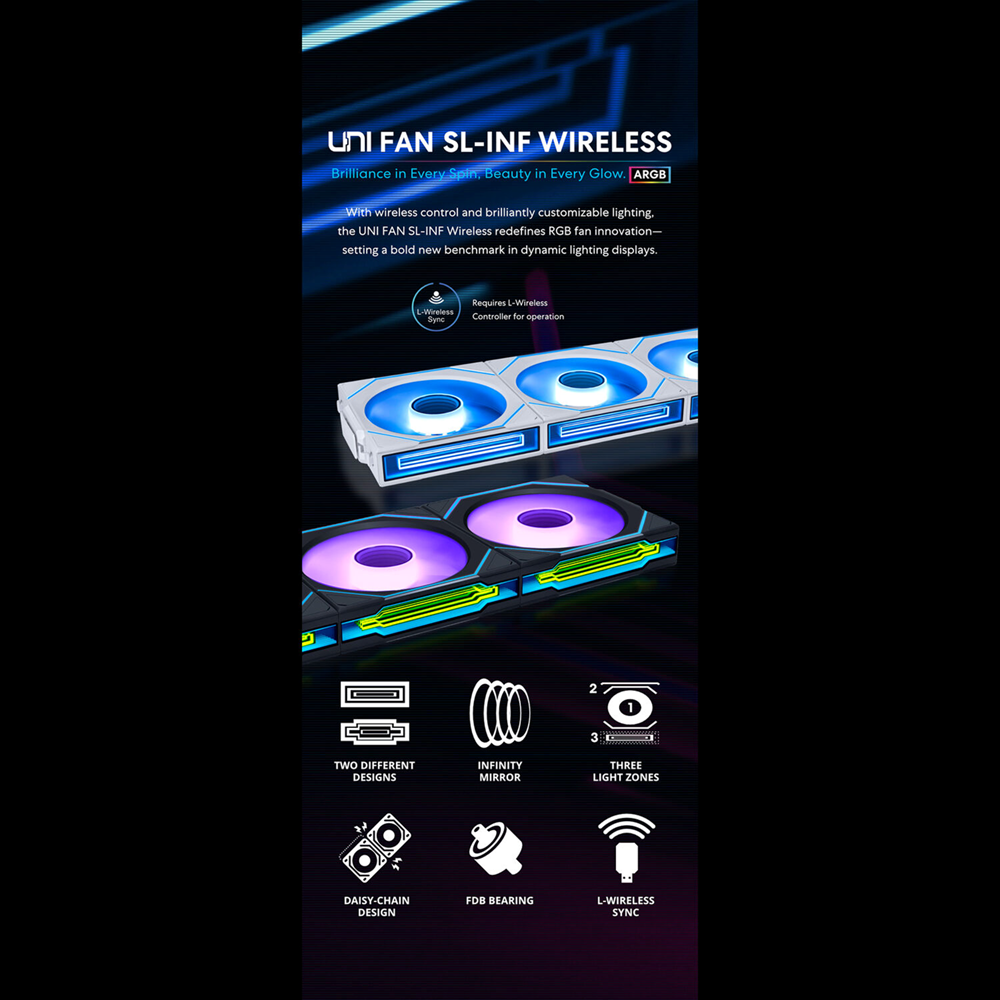 UNI FAN SL-INF Wireless is available in two color options – black and white– and supports both standard and reverse airflow orientations to suit any build style or cooling setup. Offered in both 1-pack and 3-pack options for maximum flexibility.