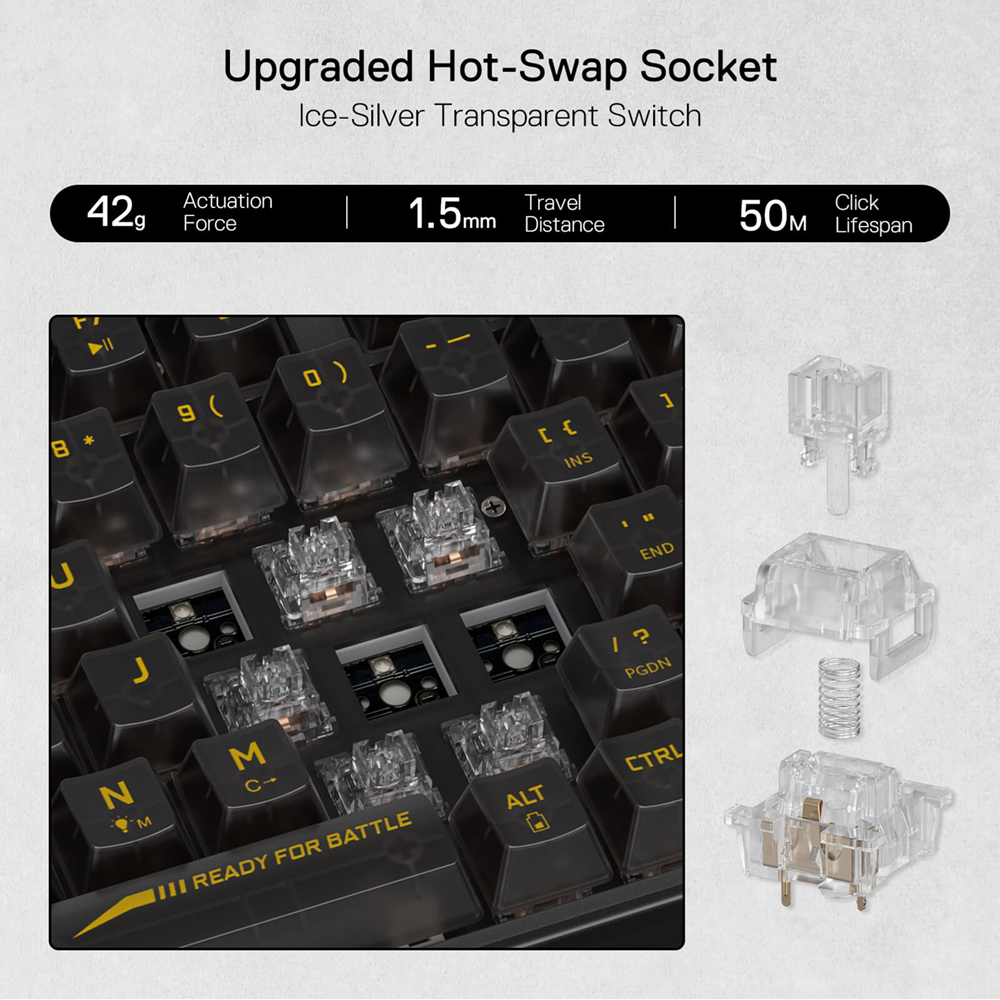 Embrace the trended full-transparent fancy aesthetics that make this keyboard truly unique. From the keycaps to the switches and even the entire board, every element is crafted from transparent materials, allowing glorious light to shine through at maximum intensity with the backlit on. Say hello to an eye-catching masterpiece that will steal the spotlight on your desktop.