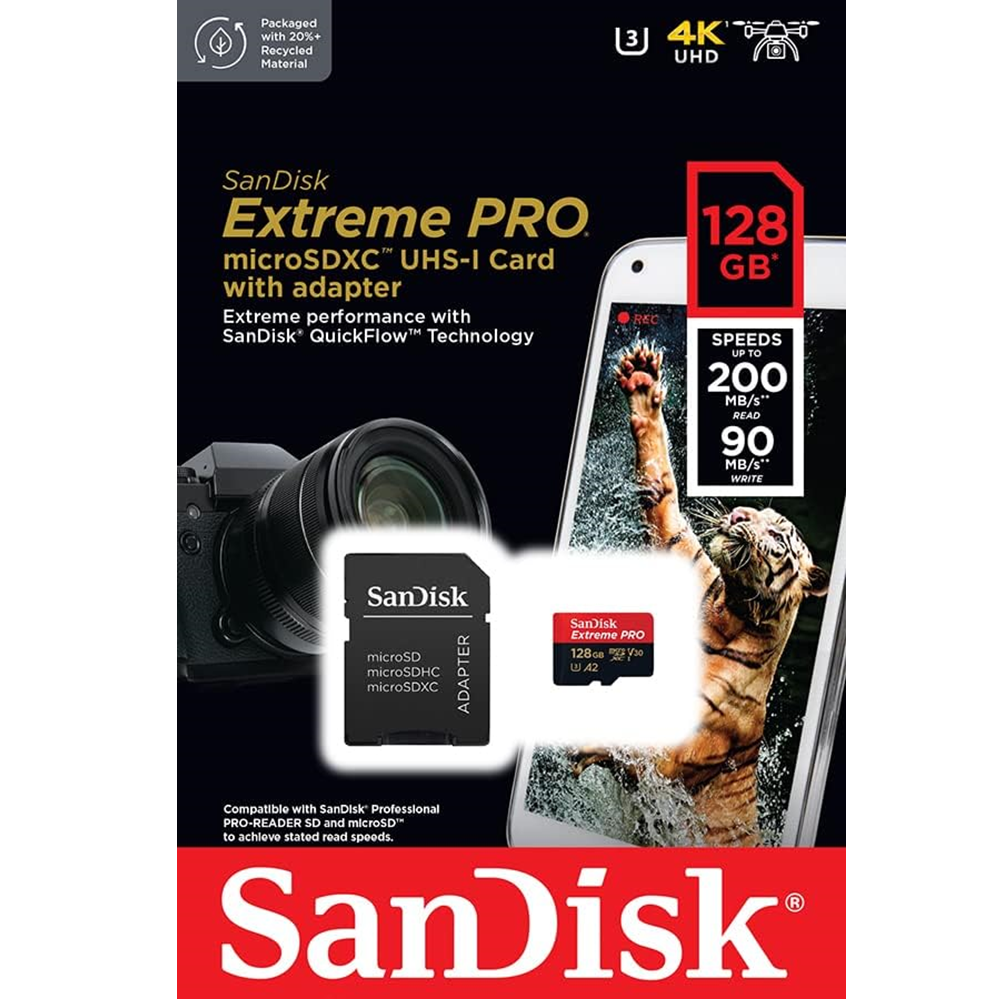 Capture fast-action photos or shoot 4K UHD video with write speeds of up to 140MB/s. The SanDisk Extreme PRO microSDXC UHS-I Card lets you shoot more and faster.