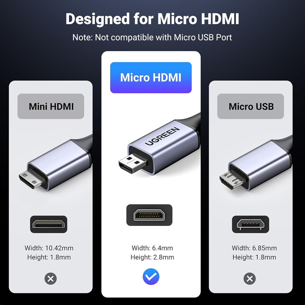 - 8K@60Hz Micro HDMI to HDMI Cable: UGREEN Micro HDMI cable supports 8K@60Hz, 4K@240Hz, and 4K@144Hz Full HD resolution. It can help you to stream audio and video from a camera, tablet or laptop through the Micro HDMI Port to Your HDTV or projector with an HDMI port. NOTE: Please pay attention to the interface of your device, micro HDMI port NOT mini HDMI or micro USB