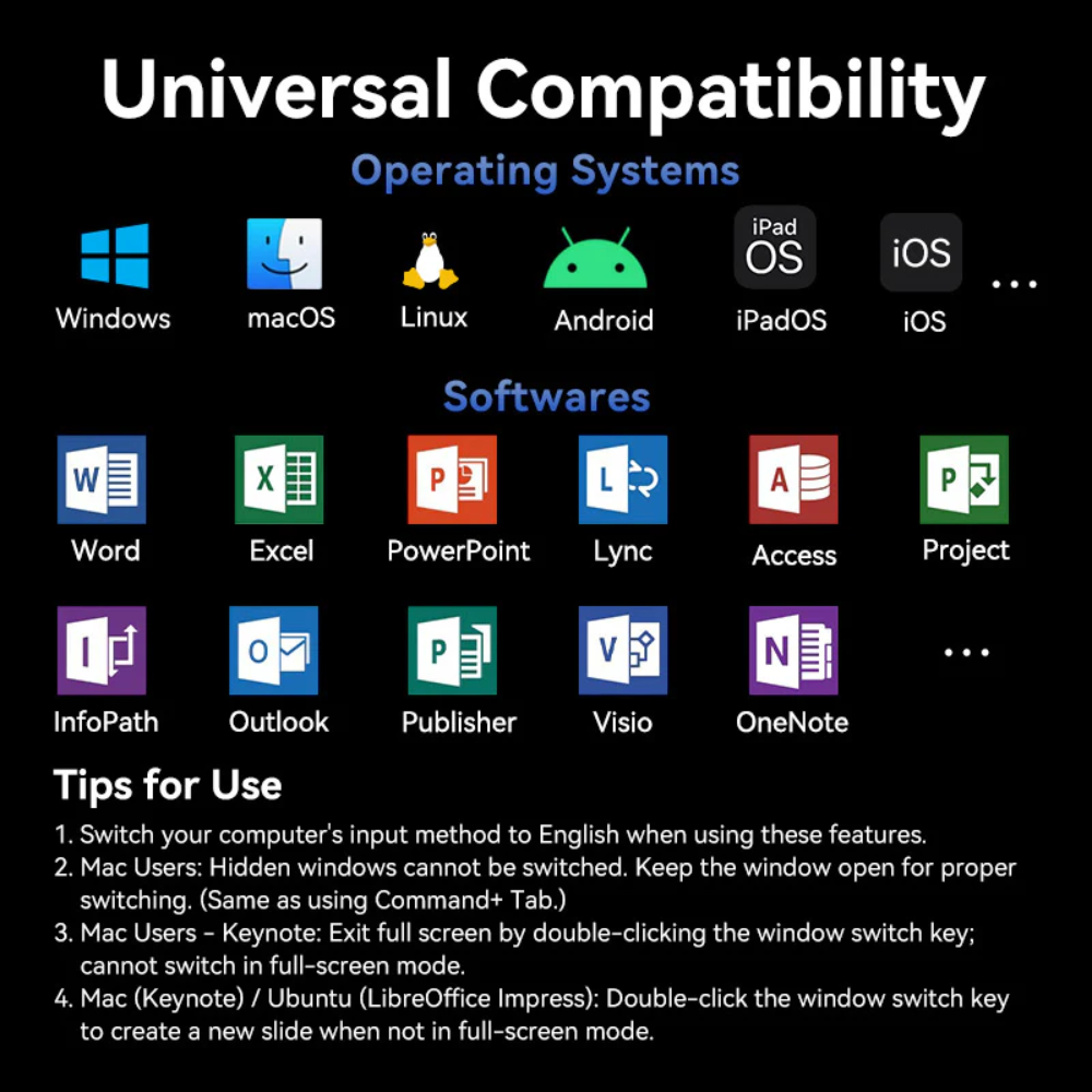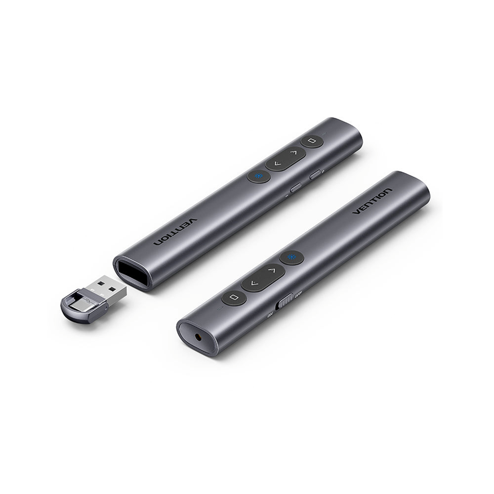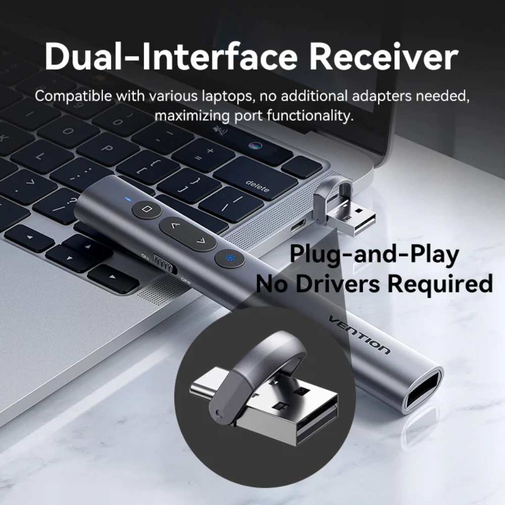 There’s no software to install. Just plug the receiver into a USB port to begin. And when the show is over, you can store the receiver in the presentation remote.